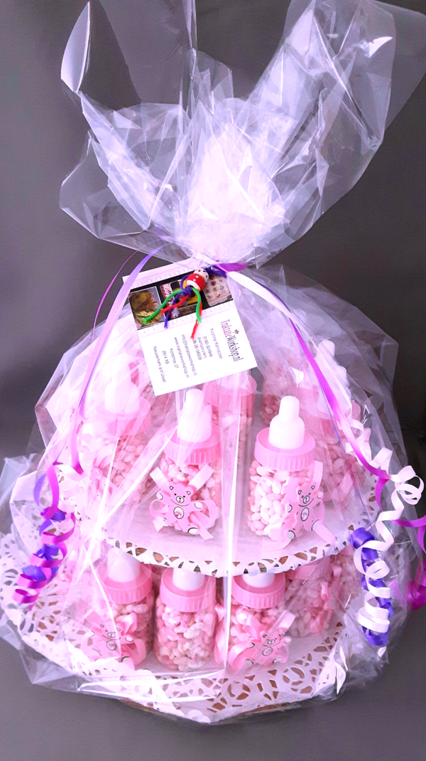 De papflesjes/speentjes worden standaard gevuld met geboortehartjes. (mintsmaak roze/wit of blauw/wit) Ieder stuk wordt voorzien van lint met kaartje en op een onderbordje geplaatst.